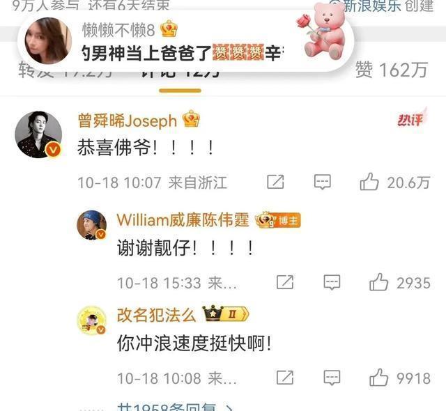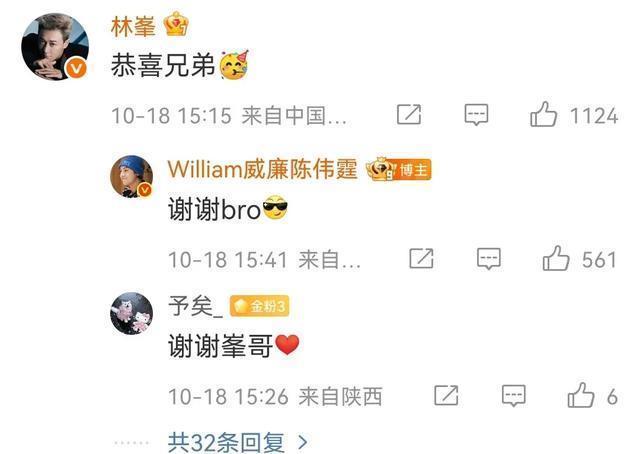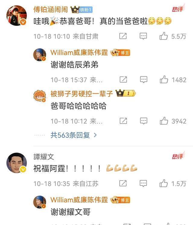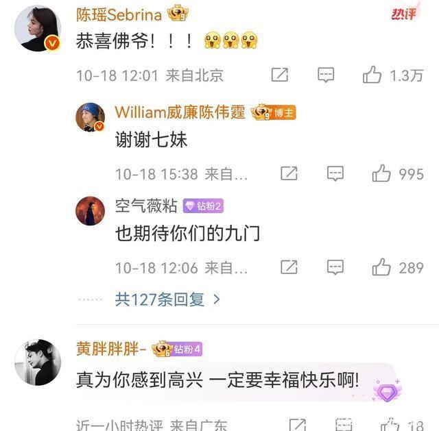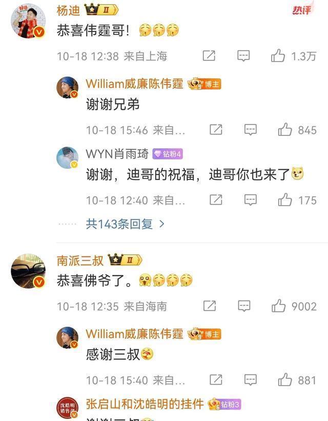 谭耀文、傅铂涵、陈瑶、杨迪、林峯等演员明星也都在评论区恭喜陈伟霆,就连南派三叔都露脸说:“恭喜佛爷”。