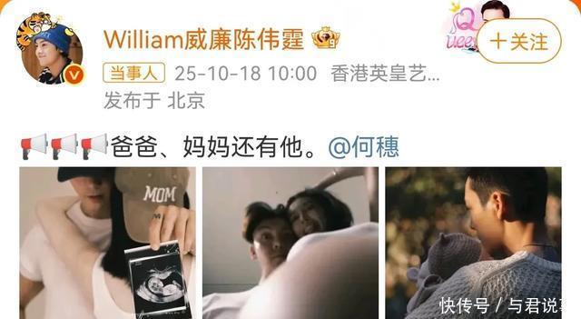 人家陈伟霆不但与何穗在一起了,而且还悄咪咪生娃了呢! 陈伟霆和何穗同步发文官宣生子,配文就六个字“爸爸、妈妈还有他”,后面都跟了三张照片。