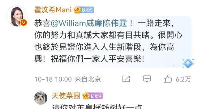 而陈伟霆的粉丝连忙在评论区喊话霍汶希:请你对英皇摇钱树好一点。