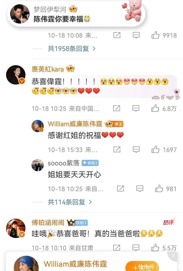 而何穗发的第一张是她手持B超影像的照片,第二张跟陈伟霆发的一模一样,第三张是她抱着宝宝的照片,宝宝没戴帽子,小毛头很是可爱。 官宣一出,评论区瞬间就炸了。惠英红老师秒回“恭喜伟霆!!!”,三个感叹号都藏不住激动;曾舜晞还调皮地喊了句“恭喜佛爷!”,一下子就让人想起《老九门》里的张启山,满满都是回忆杀;陈伟霆的经纪人霍汶希也发了长评,说“见证你进入人生新阶段,祝福一家人平安喜乐”,看得出来是真心为他高兴。